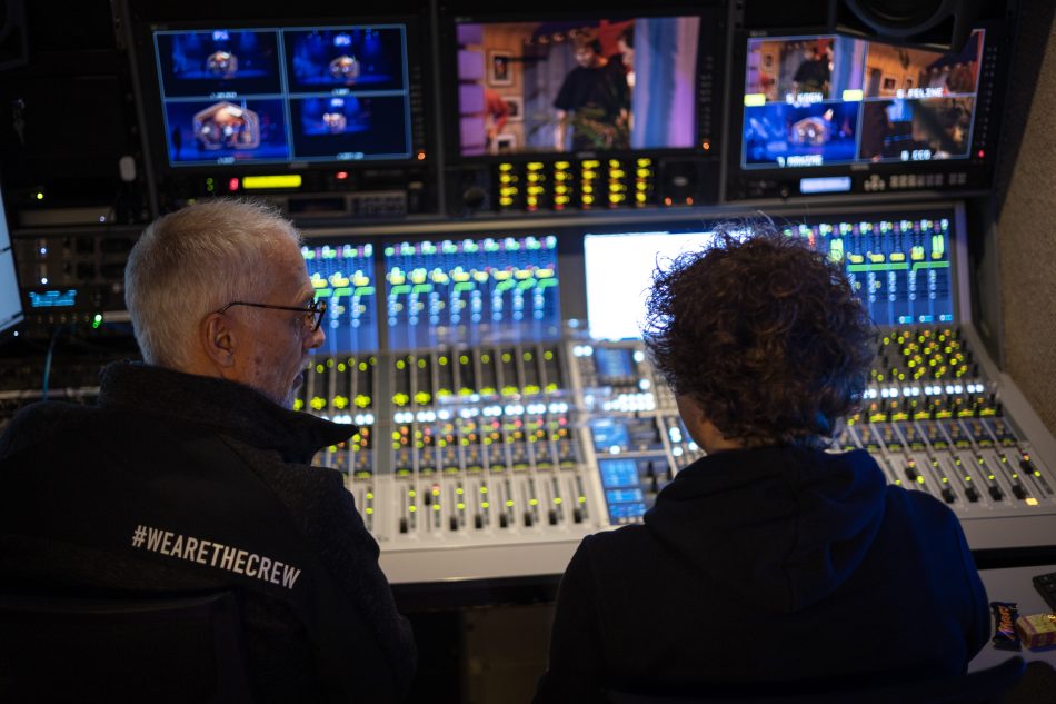 Jim Stuurman, die behalve TV-regie, camera en montage ook lang meedacht over het licht, en tussen alle bedrijven door nog een rookmachinetje ombouwde voor in de schoorsteen van ons huisje.